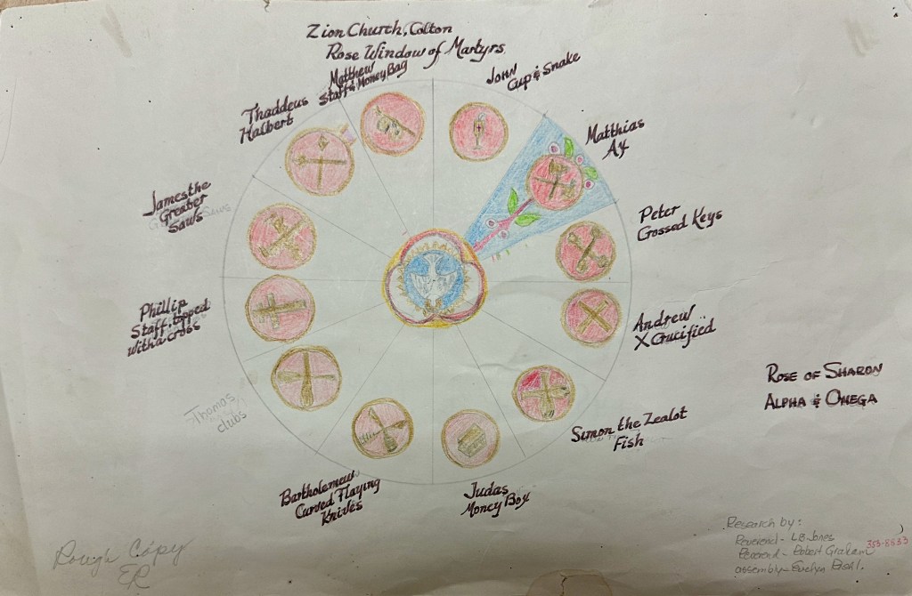 The label on the drawing associates the saws with James the Greater (son of Zebedee, St. John’s brother). However, the saws, as an iconic symbol in apostolic rose windows or Christian art, is most closely associated with James the Less (also called James the Younger or James the son of Alphaeus). Tradition holds that James the Less was martyred by being sawn in half, which is why the saw became his emblem. The saw may also symbolize James’ work as a carpenter.