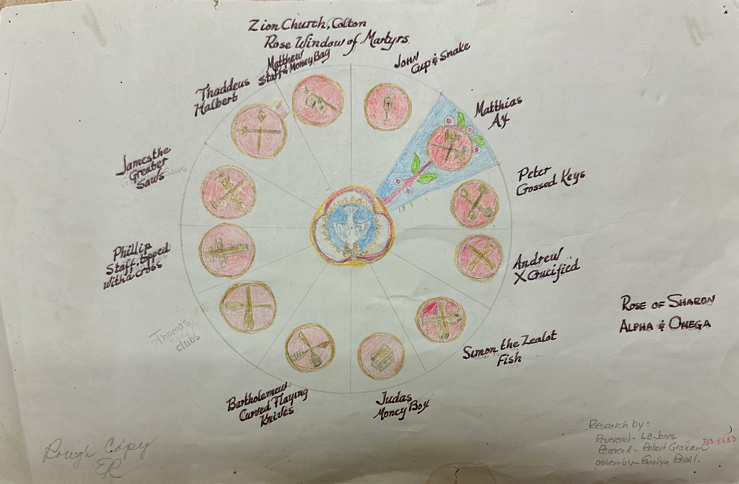 The label on the drawing associates the saws with James the Greater (son of Zebedee, St. John’s brother). However, the saws, as an iconic symbol in apostolic rose windows or Christian art, is most closely associated with James the Less (also called James the Younger or James the son of Alphaeus). Tradition holds that James the Less was martyred by being sawn in half, which is why the saw became his emblem. The saw may also symbolize James’ work as a carpenter.